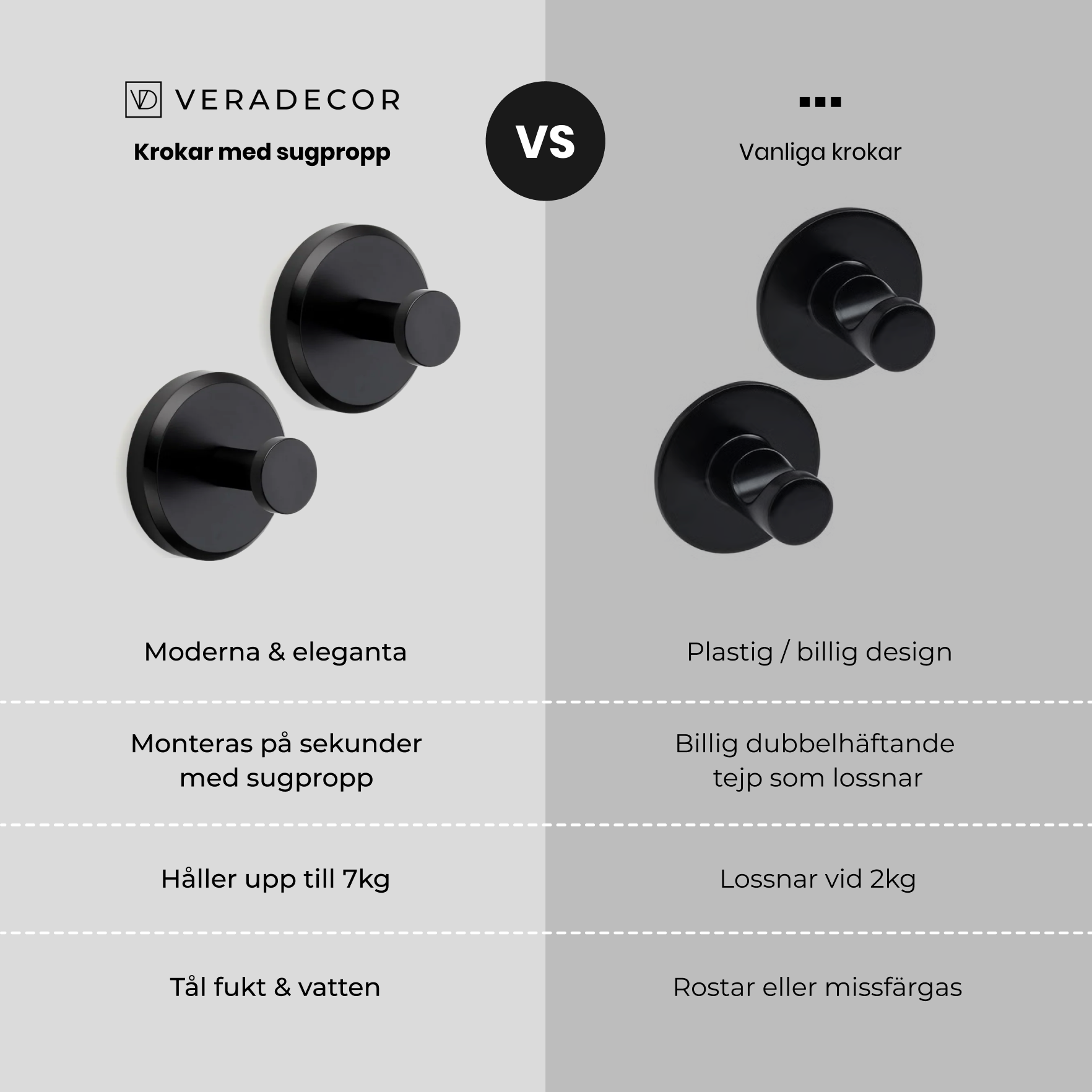 Våra krokar är testade att klara upp till 7kg. Perfekt för blöta handdukar, morgonrockar och andra tyngre tyger.